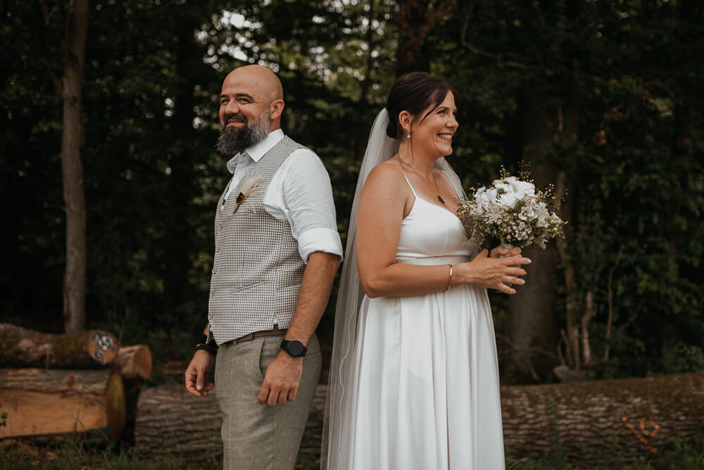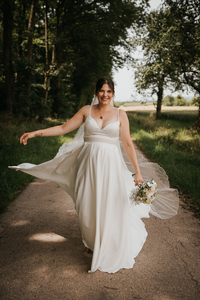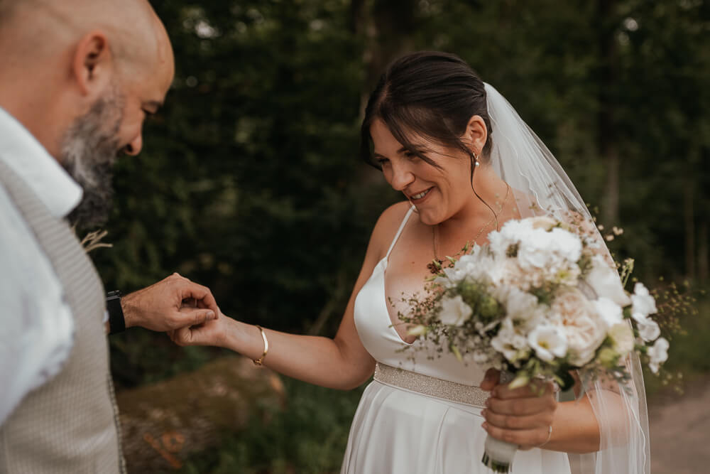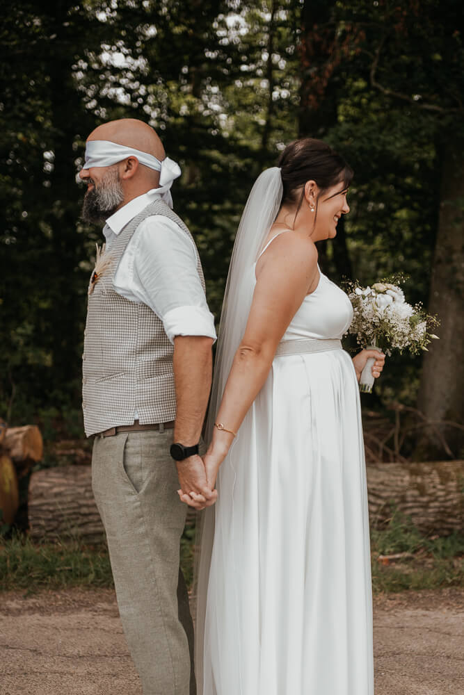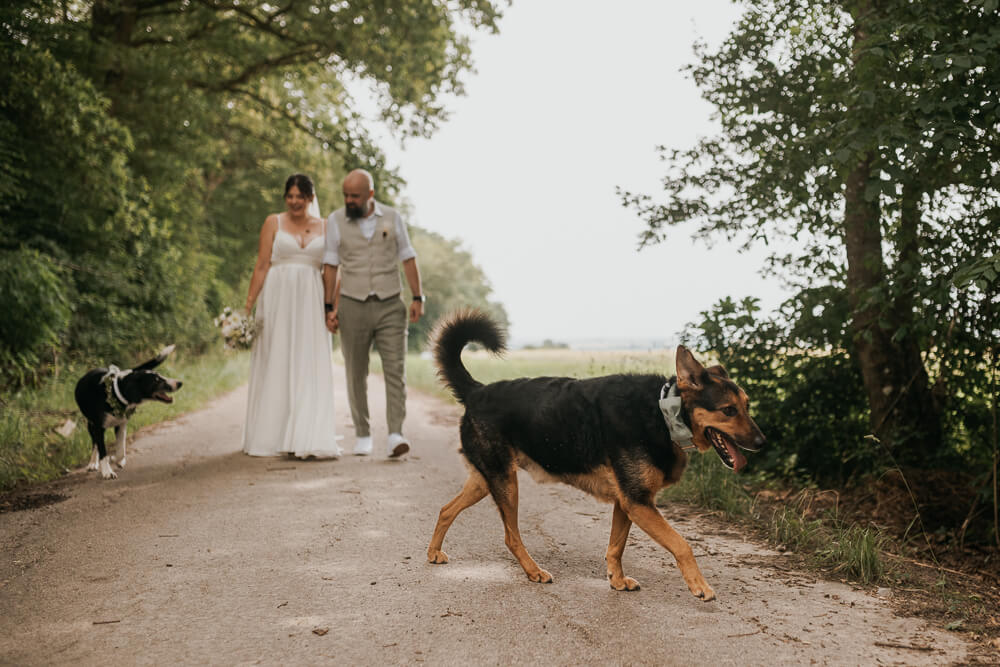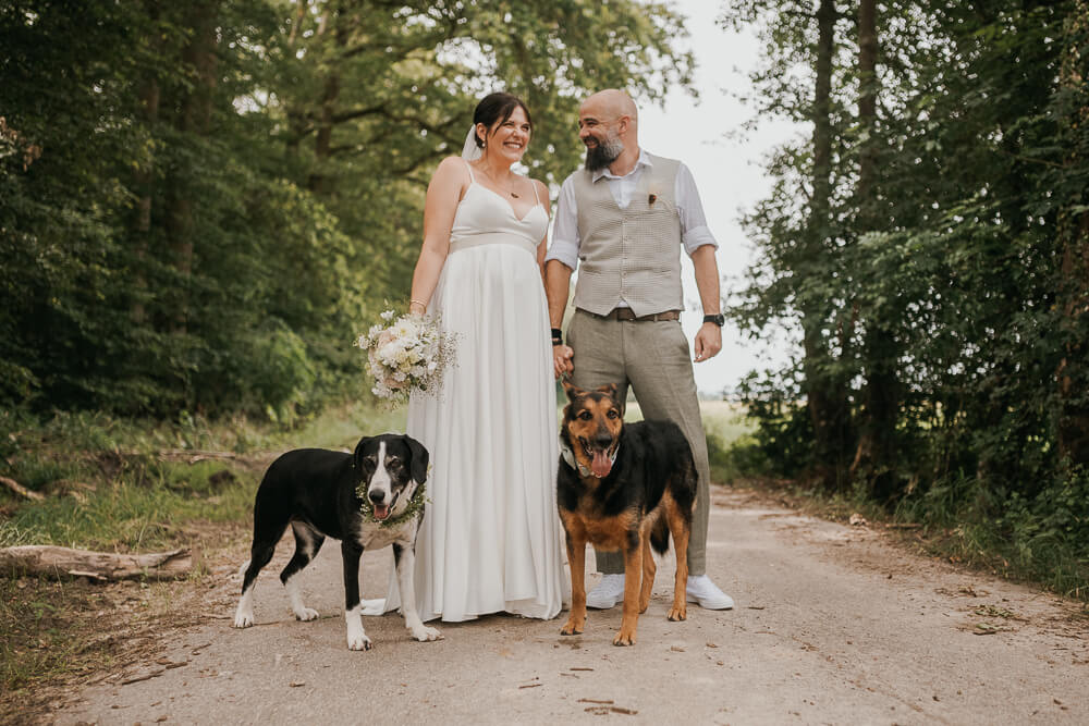 Doch bevor der große Moment kam, zogen sie sich an einen besonderen Ort zurück: ihre Lieblingsgassistrecke am Dorfrand, wo sie zwischen Wäldern und Feldern ihren First Look erleben wollten. Als ihre Blicke sich trafen, schien die Welt für einen Moment stillzustehen – pure Liebe und tiefe Verbundenheit lagen in der Luft. Das Shooting war voller Leichtigkeit und Freude, untermalt von herzhaftem Lachen und kleinen, unvergesslichen Momenten. Ihre Hunde, treue Begleiter ihres Alltags, durften natürlich nicht fehlen und machten diesen besonderen Moment noch perfekter.