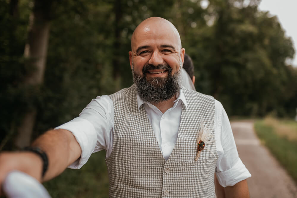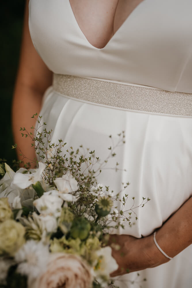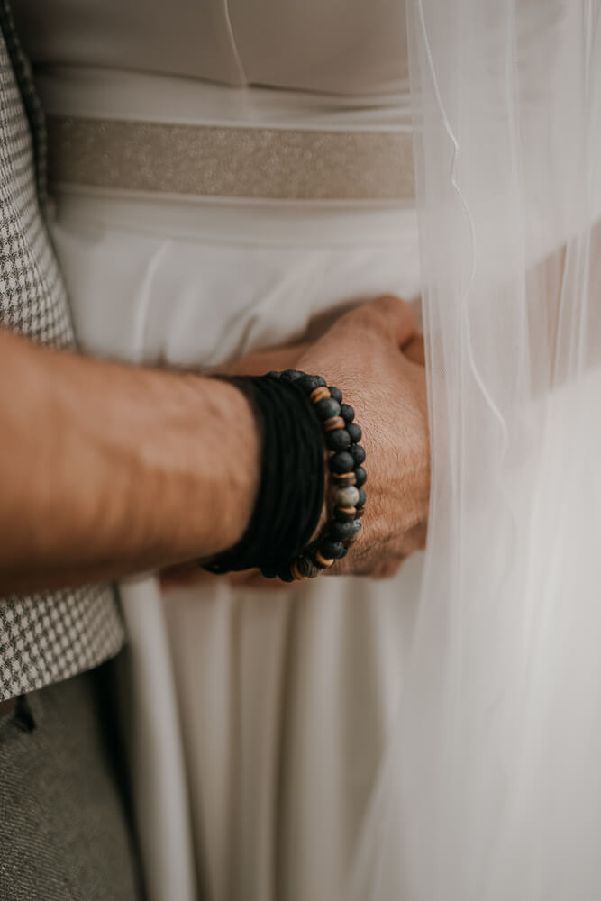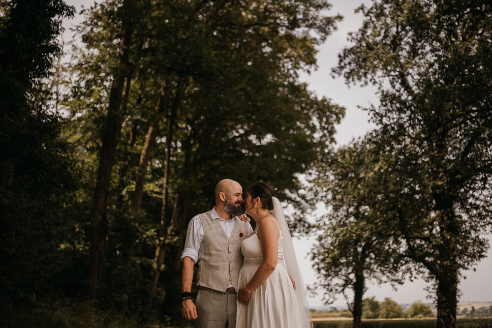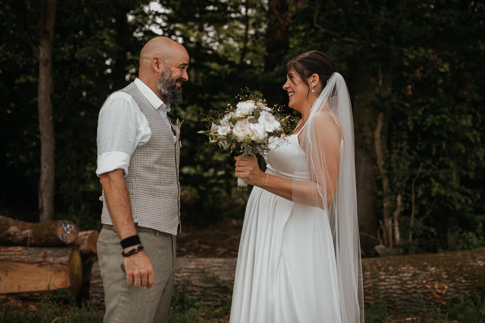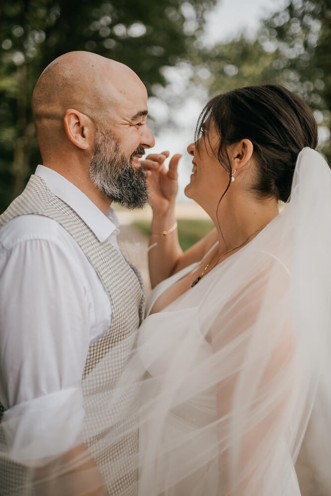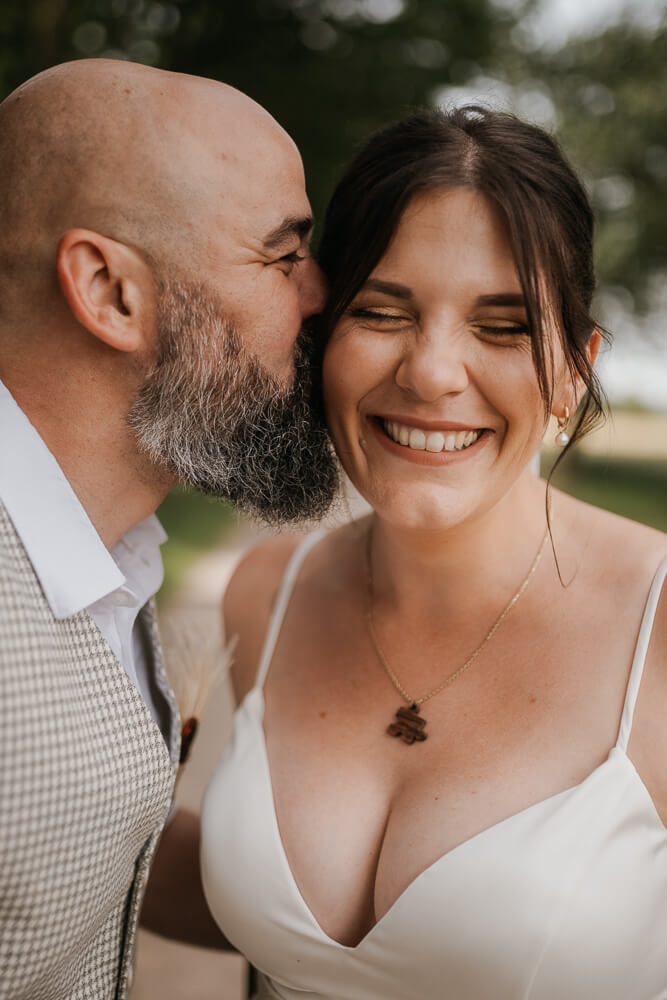 Doch bevor der große Moment kam, zogen sie sich an einen besonderen Ort zurück: ihre Lieblingsgassistrecke am Dorfrand, wo sie zwischen Wäldern und Feldern ihren First Look erleben wollten. Als ihre Blicke sich trafen, schien die Welt für einen Moment stillzustehen – pure Liebe und tiefe Verbundenheit lagen in der Luft. Das Shooting war voller Leichtigkeit und Freude, untermalt von herzhaftem Lachen und kleinen, unvergesslichen Momenten. Ihre Hunde, treue Begleiter ihres Alltags, durften natürlich nicht fehlen und machten diesen besonderen Moment noch perfekter.